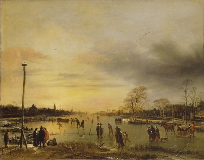 A Frozen River near a Village, with Golfers and Skaters