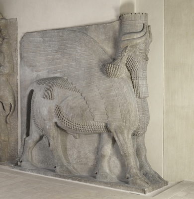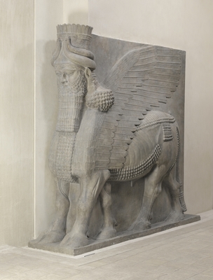 Copie d'un taureau androcephale aile du palais de Sargon, gardien de portes