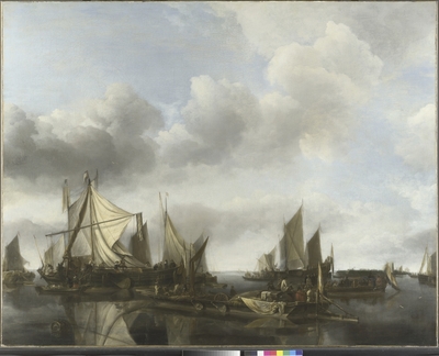 A Dutch Yacht firing a Salute as a Barge pulls away, and Many Small Vessels at Anchor