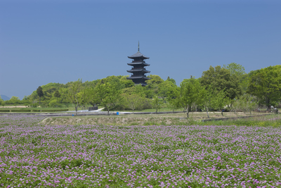 レンゲ畑と備中国分寺五重塔(重要文化財)