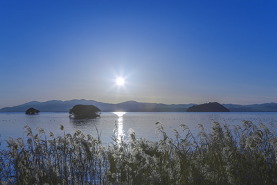 琵琶湖の夕景とヨシ