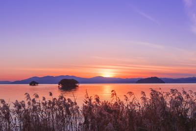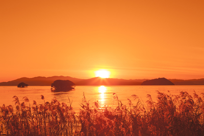 琵琶湖の夕日とヨシ