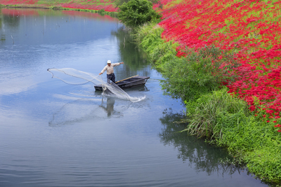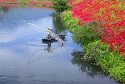津屋川のヒガンバナと投網を投げる人