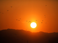 朝日とツル。出水平野にて 国指定天然記念物