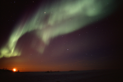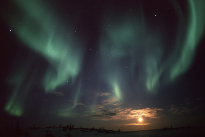 月の出と激しいオーロラ