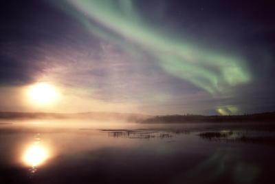 ビーバーの棲む沼にオーロラが反射する