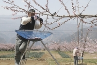 摘花作業する桃畑。飯坂にて