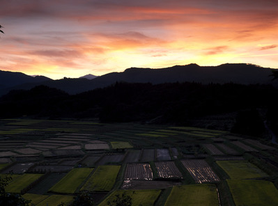 椹平の棚田 稲刈りの頃夕焼け 棚田百選