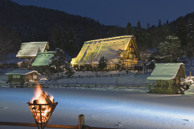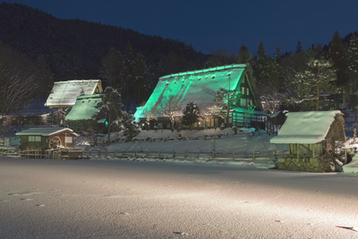 雪の飛騨民族村のライトアップ