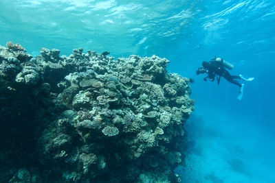 ダイバーとサンゴと熱帯魚