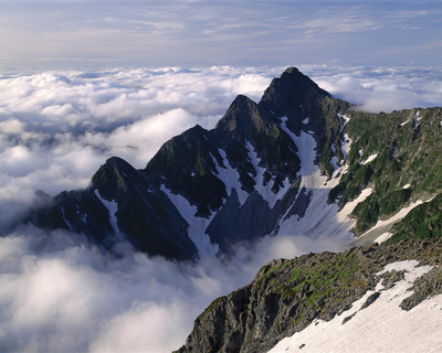 北穂高岳から湧き上がる雲に包まれる槍ヶ岳