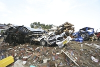 東日本大震災の津波で壊れた車と民家