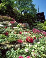 ボタンとツツジ咲く双塔園より西塔 當麻寺護念院