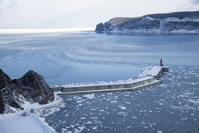 凍りはじめる宇登呂港と押しよせる流氷