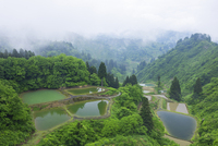 朝霧と山古志村の錦鯉の池と棚田