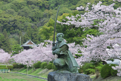 佐々木小次郎の像と桜