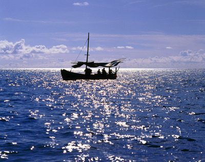朝日とヨットの浮かぶ海