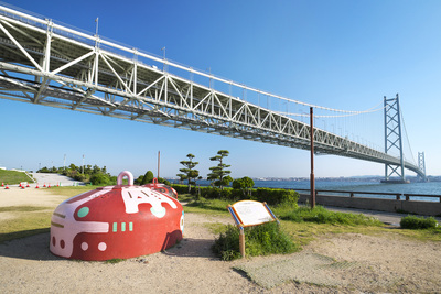明石海峡大橋とケーソンの重り(シンカー)と瀬戸内海