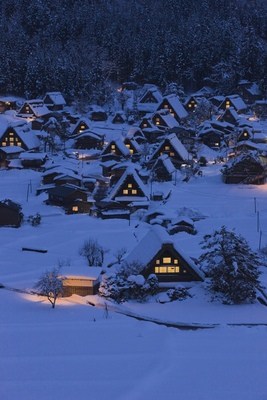 雪の白川郷合掌造り夕景