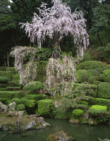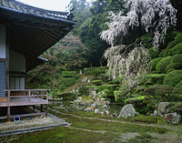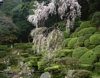 糸桜咲く医光寺雪舟庭園、樹齢約400年 名勝庭園