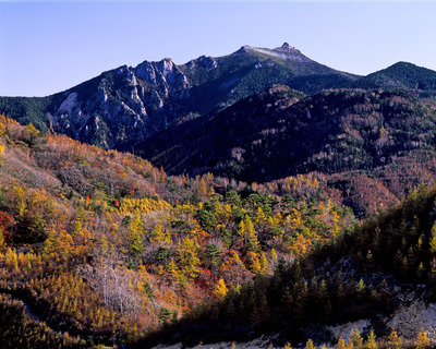 瑞牆の森のカラマツ林とカエデ紅葉と瑞牆山