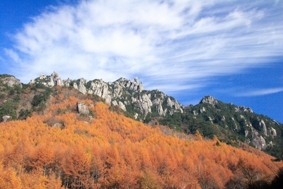 瑞牆の森のカラマツ林黄葉と瑞牆山