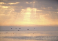 ハクチョウと朝の海