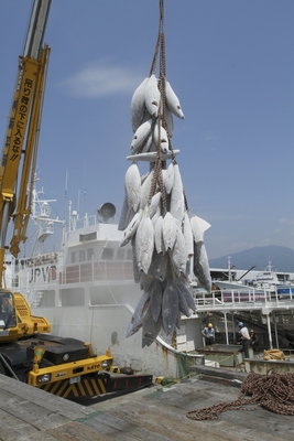 焼津港、冷凍マグロの水揚げ