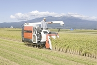 庄内平野の稲刈り 後方鳥海山