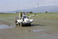 庄内平野の田植え 後方鳥海山