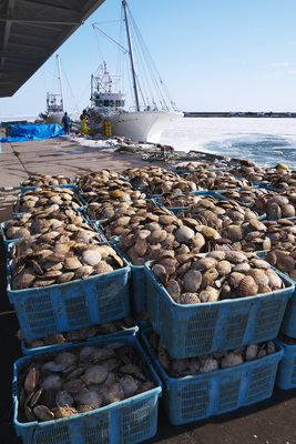 尾岱沼漁港のホタテの荷揚げとホタテ漁船