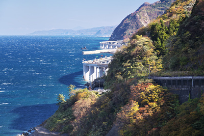 親不知の紅葉と北陸自動車道と日本海 新潟県