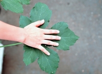 オクラ 葉と手を比べる