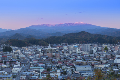 高山市街と乗鞍岳の夕景