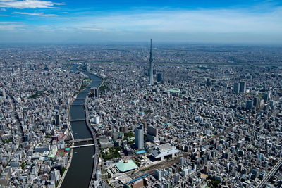 隅田川と東京スカイツリー周辺より江東区の街並み