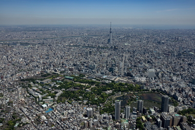 東京上野恩賜公園と上野駅より東京スカイツリー,東京湾方面