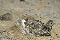 砂浴びのため羽毛を逆立てたライチョウのメスとヒナ