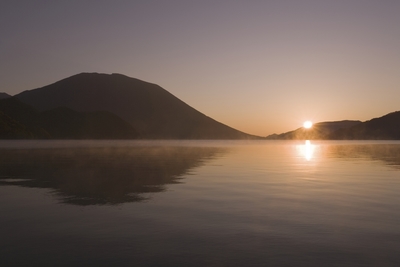 朝日と中禅寺湖と男体山