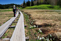 尾瀬沼大江湿原に咲くミズバショウと登山者