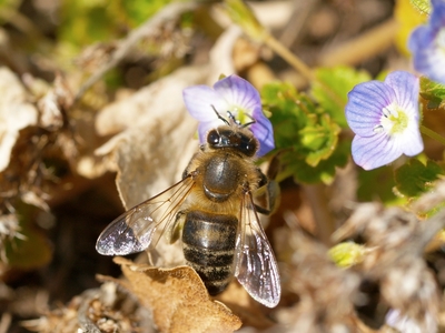 ニホンミツバチ オオイヌフグリ 「春の花畑」