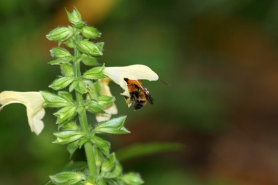 キバナアキギリの蜜を吸うため花に潜り込むトラマルハナバチ