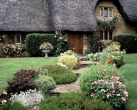 茅ぶき屋根の家と庭
