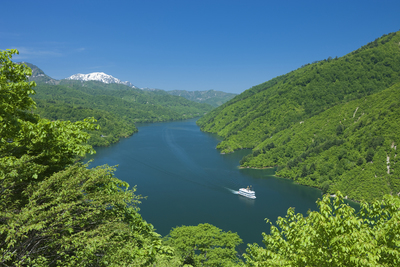 越後駒ケ岳と新緑の奥只見湖と遊覧船