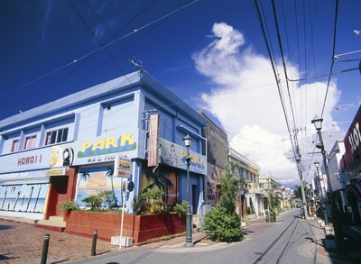 横文字、英語が多い看板がならぶ、基地前の商店街