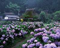 茅葺きの民家と紫陽花