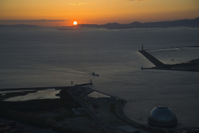 なにわ海の時空館と明石大橋夕日