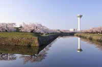桜咲く下乗橋から望む天守閣。弘前城跡 さくら名所百選 日本100名城