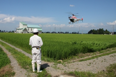 ラジコンヘリコプターでの農薬散布