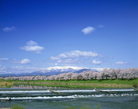 桜並木と残雪の岩手山