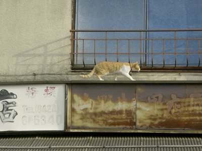 下町の軒先を歩く猫